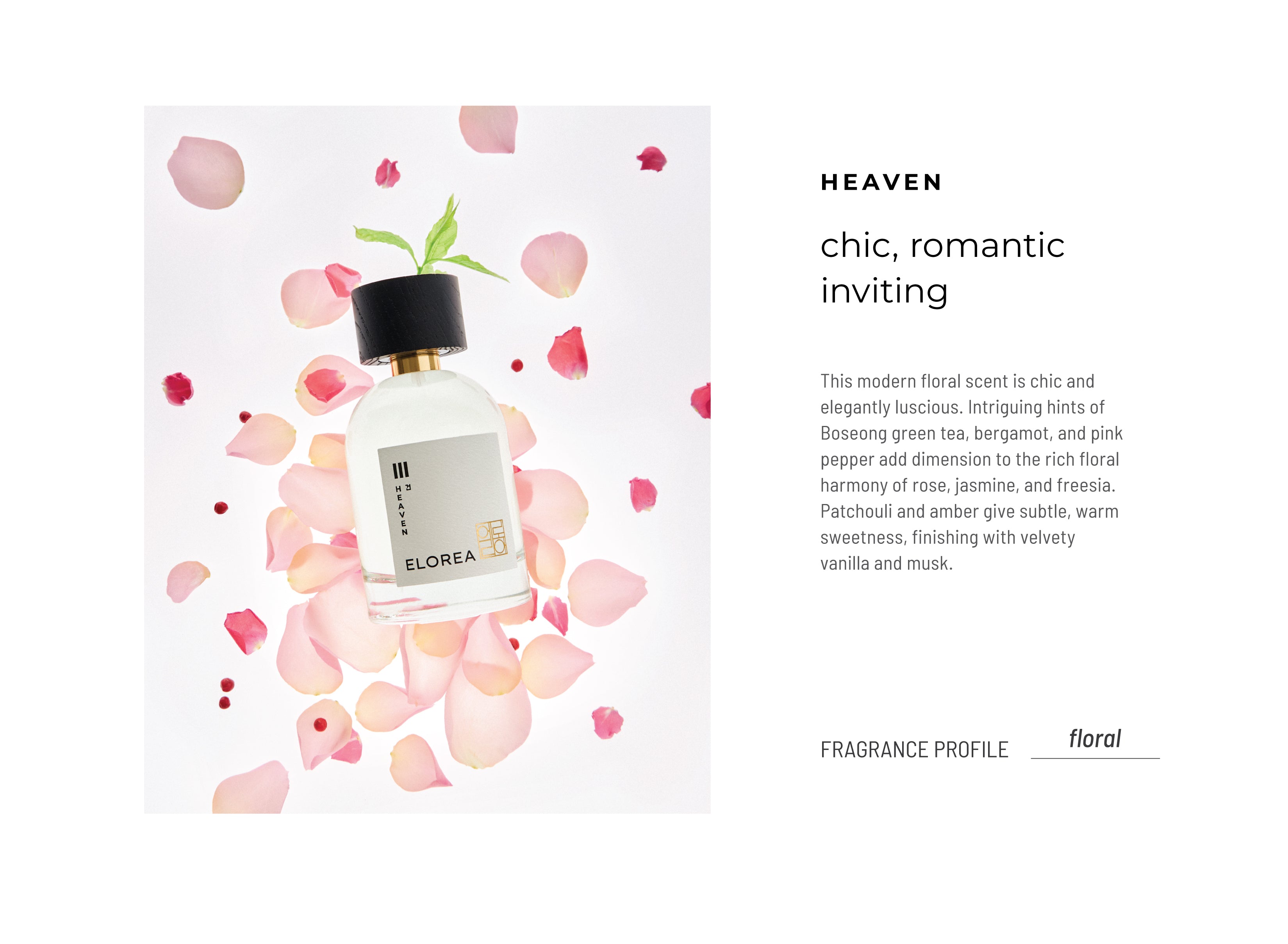 This modern floral scent is chic and elegantly luscious. Intriguing hints of Boseong green tea, bergamot, and pink pepper add dimension to the rich floral harmony of rose, jasmine, and freesia. Patchouli and amber give subtle, warm sweetness, finishing with velvety vanilla and musk. This heavenly floral scent will transport you to a lush flower garden.