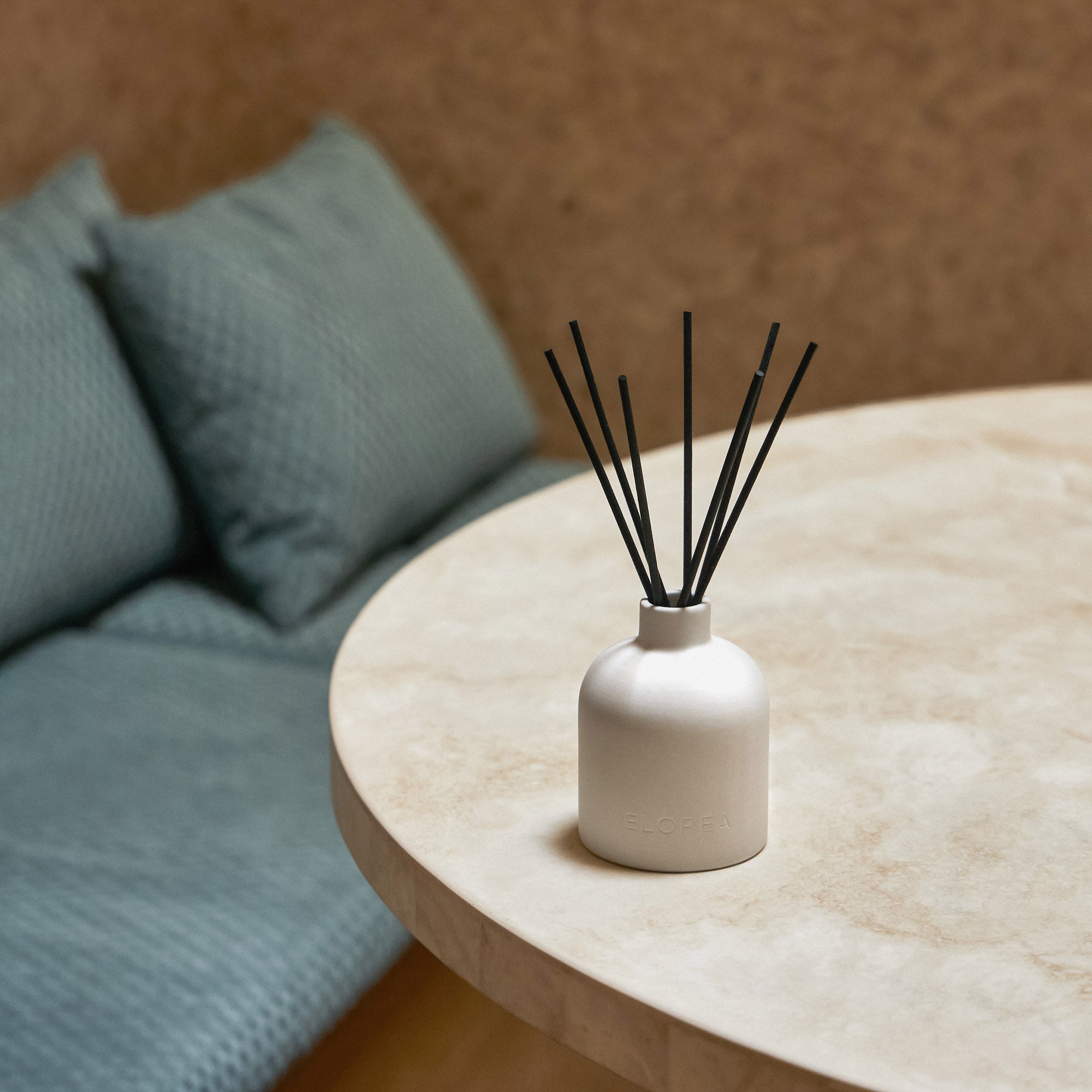 The set includes a ceramic vessel, a diffuser solution of your choice, and a pack of reed sticks.