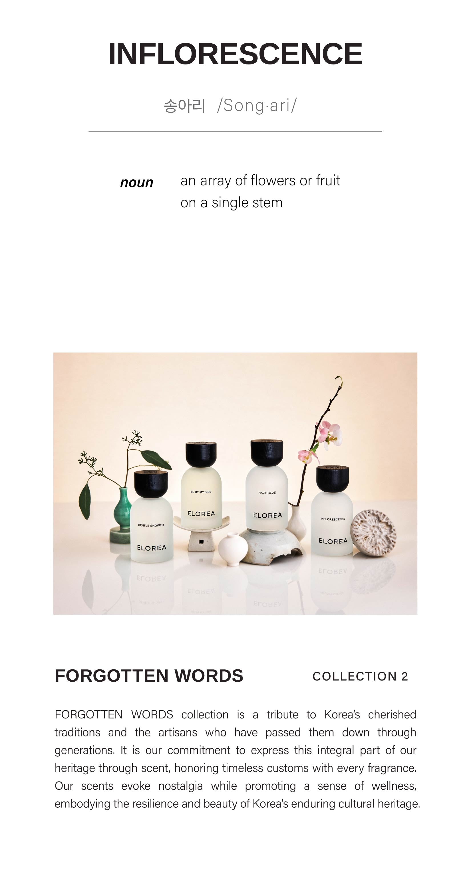 Inflorescence is inspired by the Korean word songari [송아리], which means an array of flowers or fruit on a single stem. This enchanting floral scent features clustered florals with a touch of tartness from schisandra berry and mulberry, rounded with the softness of white amber and musk. It’s a scent that will make your heart flutter.